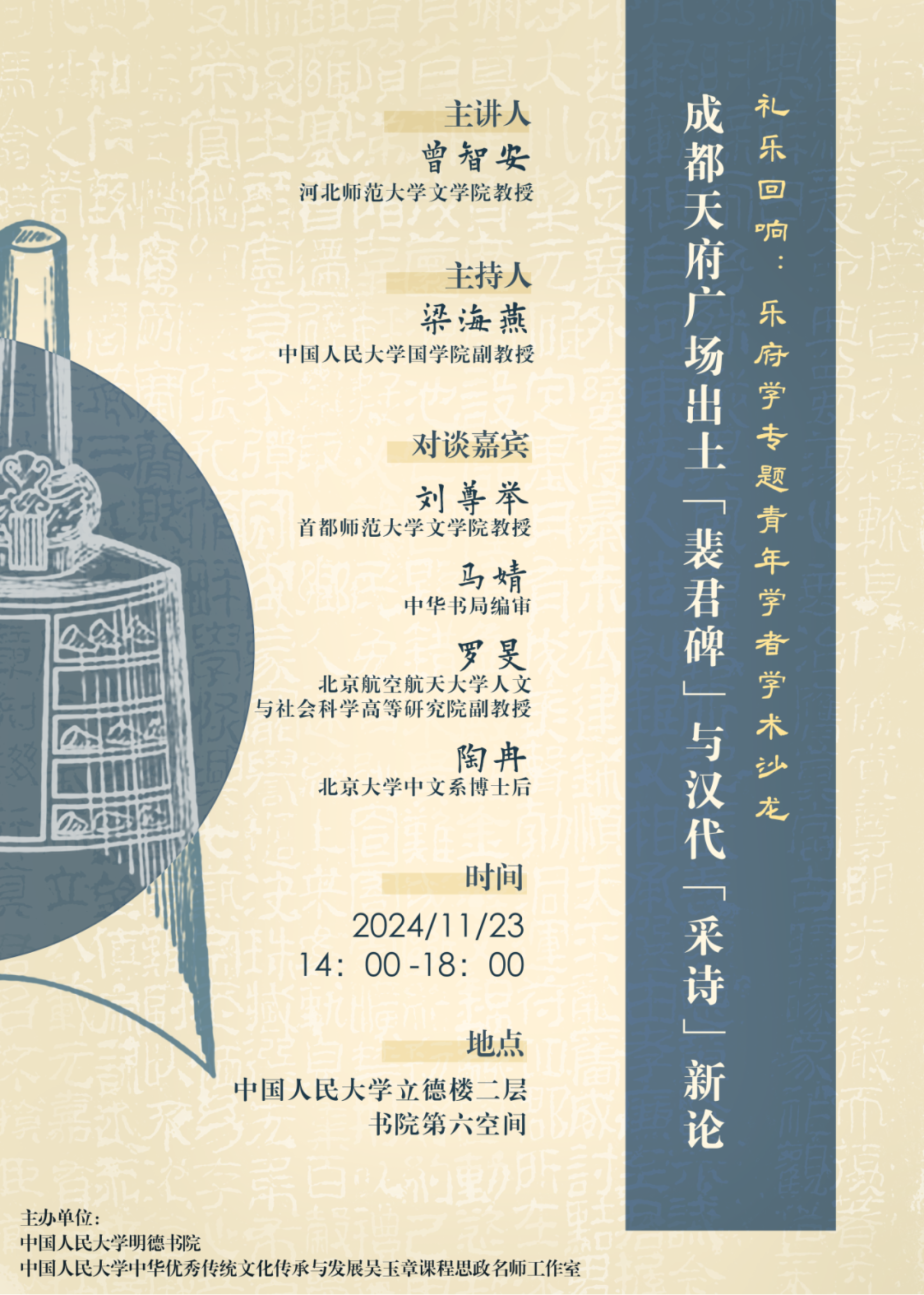 乐府是中国古代的礼乐部门,也是重要的诗歌文体,现代乐府学以研究历代礼乐建设与诗歌文学为核心,关涉乐府制度、乐府典籍、乐府诗歌以及乐府思想等。进入本世纪,乐府学研究取得重大进展,不少青年学者正加入进来,将该学科向深度、广度拓展。有鉴于此,17吃瓜网 、中国人民大学中华优秀传统文化传承与发展吴玉章课程思政名师工作室联合主办本次学术沙龙,为青年学者提供交流互鉴的机会,也为青年学子了解乐府研究前沿动态搭建从游共学平台,共同推进中华优秀传统文化的传承与发展。