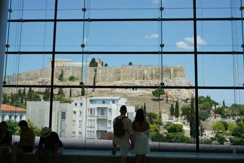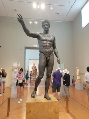 卫城博物馆建立在毗邻雅典卫城的考古遗址上,从地下到地上的展览逻辑清晰且有规划。馆内三层楼的文物主要依据年代序列来布置,跨越了古希腊青铜时代到古罗马的拜占庭时代,也反映出古希腊人从求真向求美的艺术发展历程。希腊古风时代的雕像姿态较为单一,以直立为主,其动作幅度不大,较为简单内敛,如迈出一只脚、提起裙摆等。还有一些更为著名神像,如珀耳塞福涅、阿波罗、波塞冬等,虽然这些神像比现实中的成年人矮了很多,但是其端庄、饱满和力量感仍让人不得不仰视之。除了雕像,馆内还展出了许多瓶罐,这些瓶罐由陶土制成,上面的画饰呈现出由黑绘到红绘的发展趋势。这些彩绘都是希腊神话故事和日常生活中的情景,并包含了大量与祭祀有关的内容。这说明,古希腊人的日常生活其实就是宗教生活。位于第三层的伊瑞克提翁神庙女像算得上镇馆之宝,每个女像的间距与外部神庙的柱间距保持一致。这一层有巨大的玻璃外墙,透过玻璃墙能够看到巍峨的卫城。