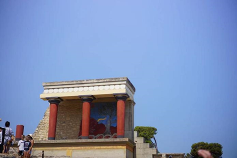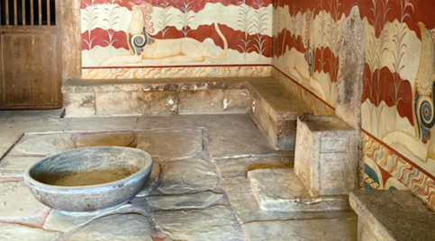 克诺索斯王宫就是米诺斯王室的居住地。王宫内有祭祀用的宗教空间,也有用于日常起居的生活空间。这座宫殿留给人的第一印象就是鲜艳的色彩艺术,如红色、蓝色、白色,这几种对比强烈的颜色经常一起出现在王宫的柱子和壁画上,彩绘图案包括海豚、斗牛、仕女、王子等。据说,这些颜色代表了大自然,古人为了把外部的自然搬入室内,于是使用了这些鲜明的颜色。不仅如此,壁画上的人物也特色鲜明,主要体现为夸张的细腰,例如头戴百合花王冠的王子。在王宫的双面斧厅里陈列着米诺斯的王座,四周的墙壁上是以红色、白色为主色调的吉祥物彩绘。有趣的是,王座非常低矮,大小如同今天的板凳。我们现在在克诺索斯遗址看到的壁画是埃文斯等人复原过的,其部分真迹保存在伊拉克里翁考古博物馆里。该博物馆还保存着克里特人用于书写记录的泥板,上面的文字被今人称为线形文字A;迈锡尼人则借鉴了这种文字系统,将其演化为线形文字B。古希腊语正是产生于这两种古老文字的基础之上。米诺斯文明的自然、纤细、轻巧,完全不同于后起的迈锡尼文明的粗狂、勇武、厚重。