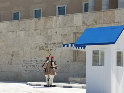 同中国的一线中心城市一样,夏天雅典市区的温度比沿海地区高出很多,市内的历史性地标呈现出古今交融的特色。泛雅典娜体育场与庇西特拉图创立的泛雅典娜节有关,在这个节日里,古希腊人要在特定场地内举办竞技和文艺比赛,后来这里演变成奥林匹克运动会的体育场。体育场的规模不大,其布局是现代体育场的原型:观众可以坐在周围逐渐升高的环形石阶上,向下就能看到运动员。沿途走不久就是宪法广场,它在雅典的地位相当于天安门广场在北京的地位。广场中央是笔直站立的卫兵,他们在酷热的天气下穿着厚重的制服,纹丝不动,让人不禁敬佩他们的意志力。游人会在每天下午固定时间段观看到卫兵的换岗仪式,伴着成群的鸽子飞翔在广场上空,场面热闹却有序。泛雅典娜体育场和宪法广场的总体样貌庄重而现代,在高低起伏的雅典山城里,这两座建筑与不远处的雅典卫城风格迥异。