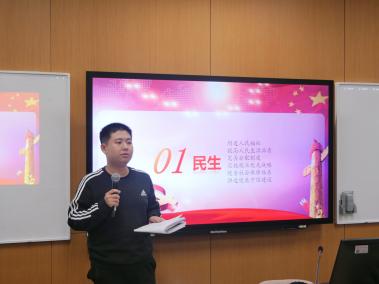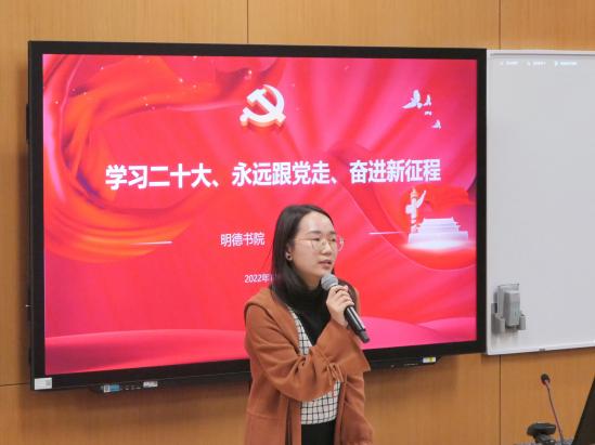 梁艺馨首先介绍了中国共产党第二十次全国代表大会召开的总体情况和两个支部成员前期学习情况。随后,两个支部成员分别围绕“民生”“自信”“发展”“青年”“创新”“共同体”六个关键词展开小组交流讨论。在展示环节,六个小组分别围绕本组关键词,结合理论学习感悟和个人生活体验,从多个角度多个方面展示了本组学习讨论的成果。