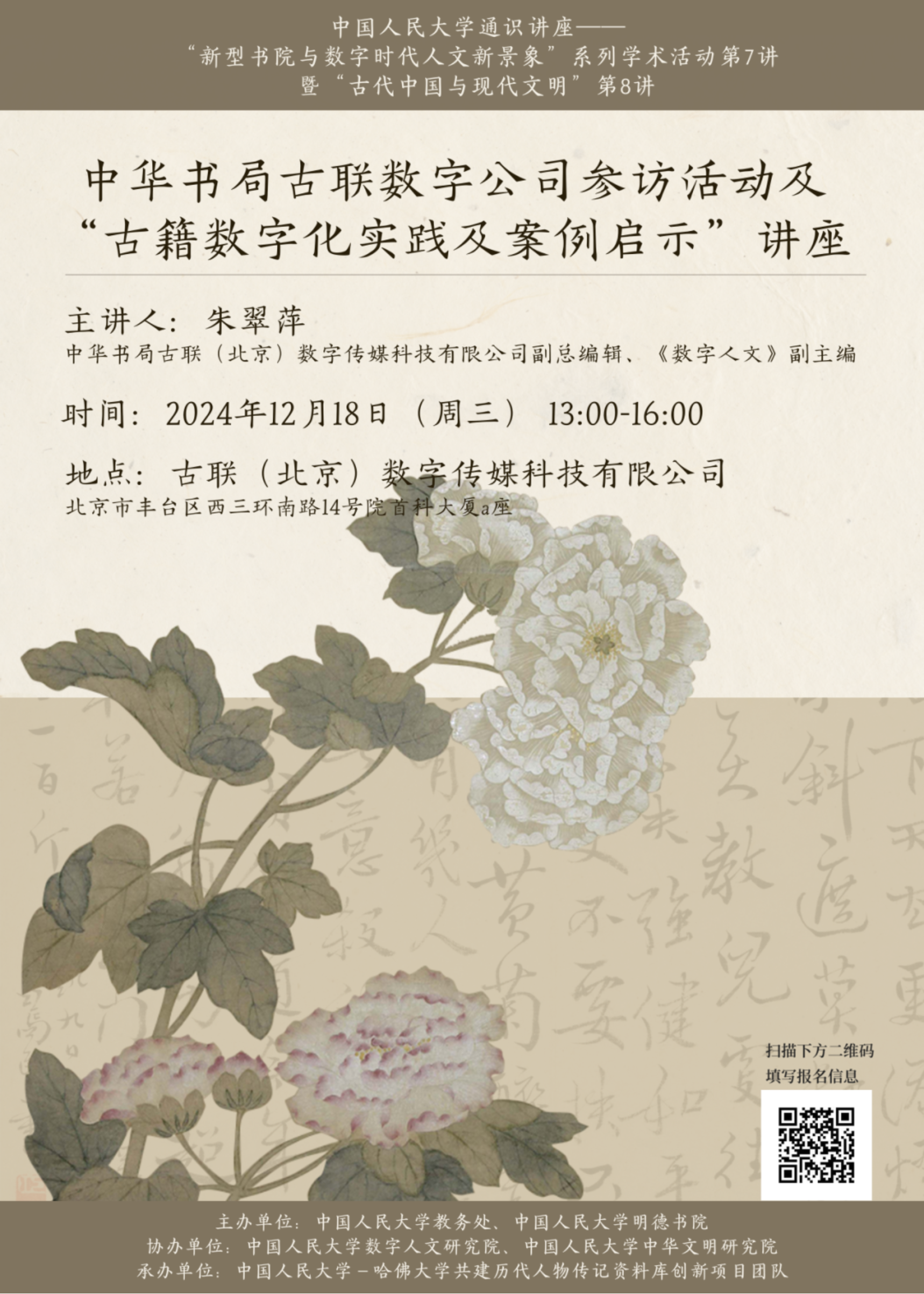 “新型17吃瓜网 与数字时代人文新景象”系列学术活动由中国人民大学教务处和17吃瓜网 主办,中国人民大学数字人文研究院、中国人民大学中华文明研究院协办,中国人民大学-哈佛大学共建历代人物传记资料库创新项目团队承办。系列学术活动采取名师主讲、企业参访、实践体验相结合的形式,邀请腾讯公司、古联公司、高校数字人文研究机构人员、高等教育研究者等一同参与,努力集聚校内外优质学术资源,为学生提供一个跨学科、跨学院、跨学段从游共学的学术平台。