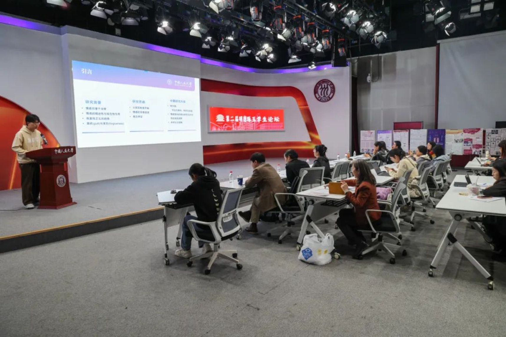 在学术论文报告会上,来自哲学院、国学院、艺术学院、历史学院、文学院、国际关系学院的13名学生从各自专业领域出发,围绕法哲学研究、绘画意象、抗战史、认识论、中国古代文学、当代中国宗教、历史地理学等主题作学术报告。