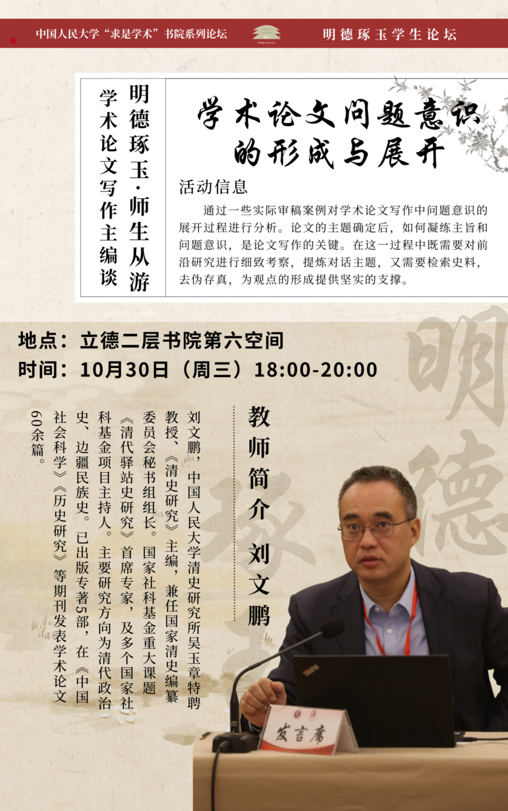 问题意识是学术研究的出发点与动力,在对前沿研究的细致考察和去伪存真的史料检索中,我们才能提炼对话主题,为学术论文观点的形成提供坚实基础。在本期琢玉论坛“学术论文写作主编谈”中,刘文鹏老师将通过实际审稿案例对学术论文写作中问题意识的形成和展开过程进行分析,帮助同学们树立问题意识,展开问题意识,提升学术研究能力。