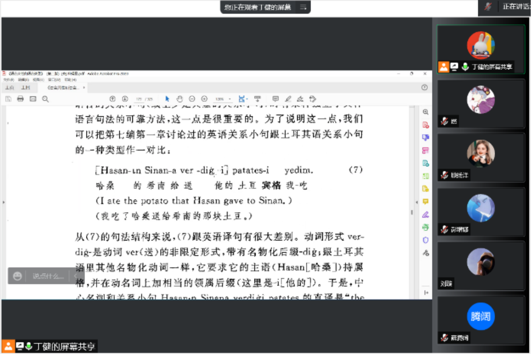 本次读书活动中,我受益良多。来自文学院的丁健老师对《语言共性和语言类型》这本书进行了深入浅出的讲解,同时和同学们进行了许多有趣的互动,使我对语言类型学的知识有了初步了解和认识。