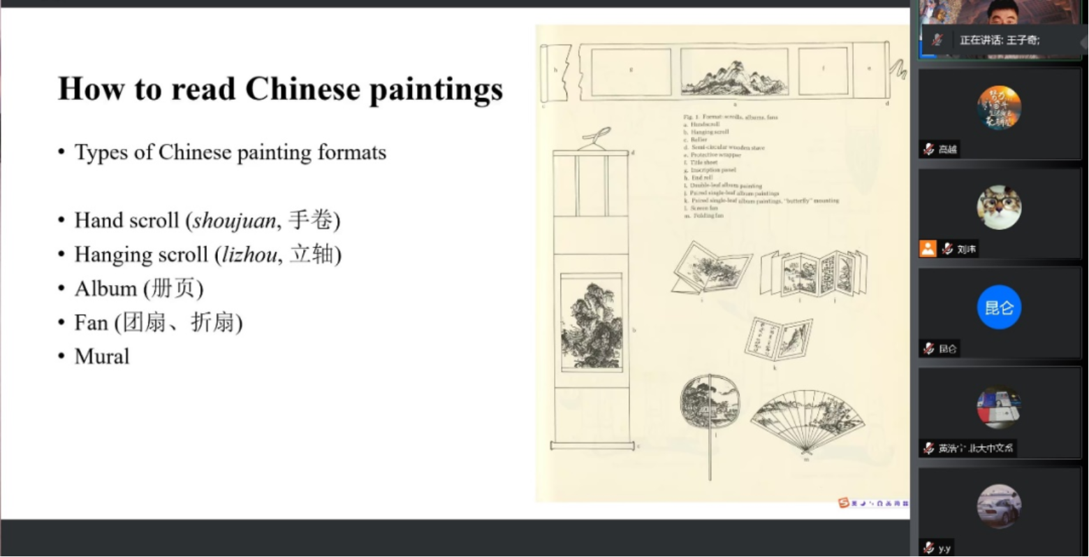 之后王老师讲到《清明上河图》作为一幅长卷,有许多问题值得我们探讨:古人怎么看手卷?作者是谁?时代如何?画的是哪里?表现的主题是什么?这里老师对比了欣赏古代绘画的不同方式,特别是观看手卷和立轴的区别,我们在欣赏手卷时是采取一段一段看的方式,这可以使我们随着画面的收放目光不断游移,在手卷的观看方式上体现出时间性与空间性的交汇。