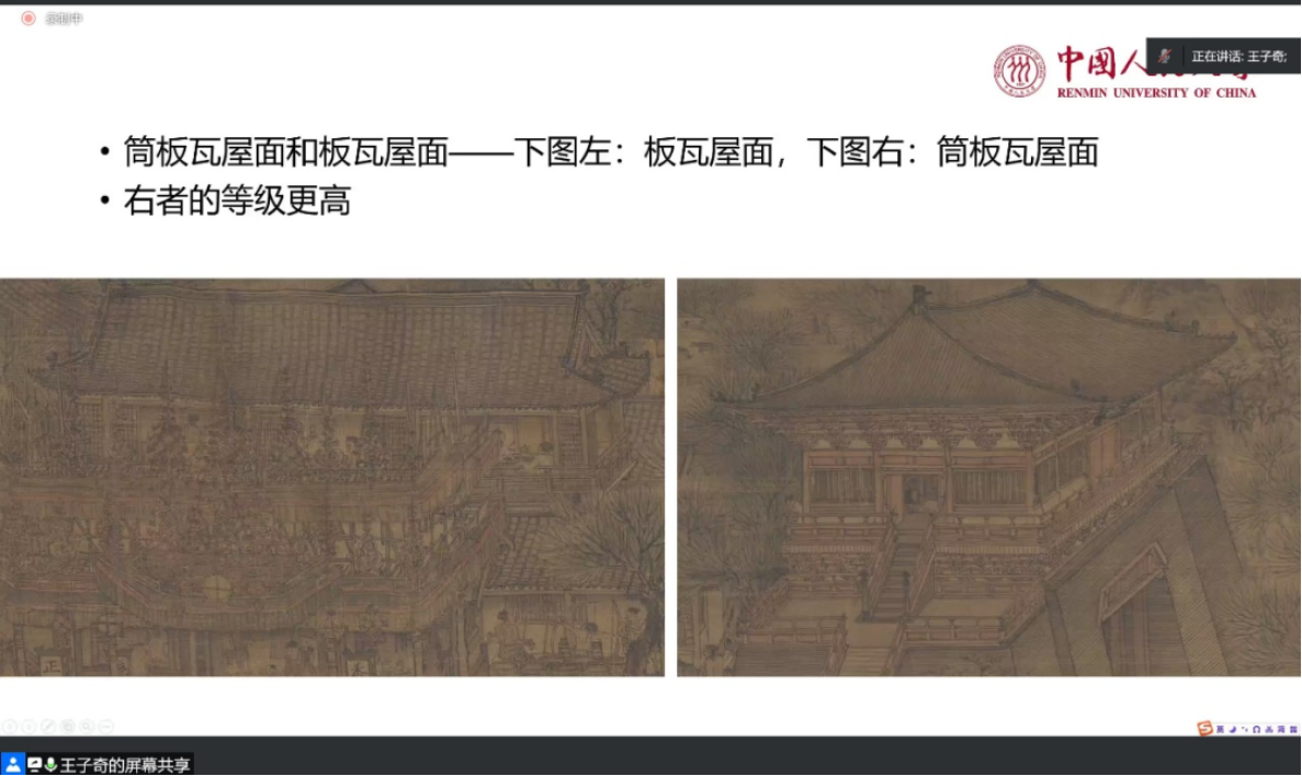第四组关键词:等级与礼制。“建筑不仅是一项工程,还是艺术与文化的综合载体。”建筑反映的还有诸如当时社会等级、礼制等文化要素,老师分析了《清明上河图》中的一些建筑的装饰、型式,结合史料实证,明晰了等级、礼制对建筑的重要影响,从另一个维度对《清明上河图》进行解读,加深了各位老师、同学对《清明上河图》的理解。