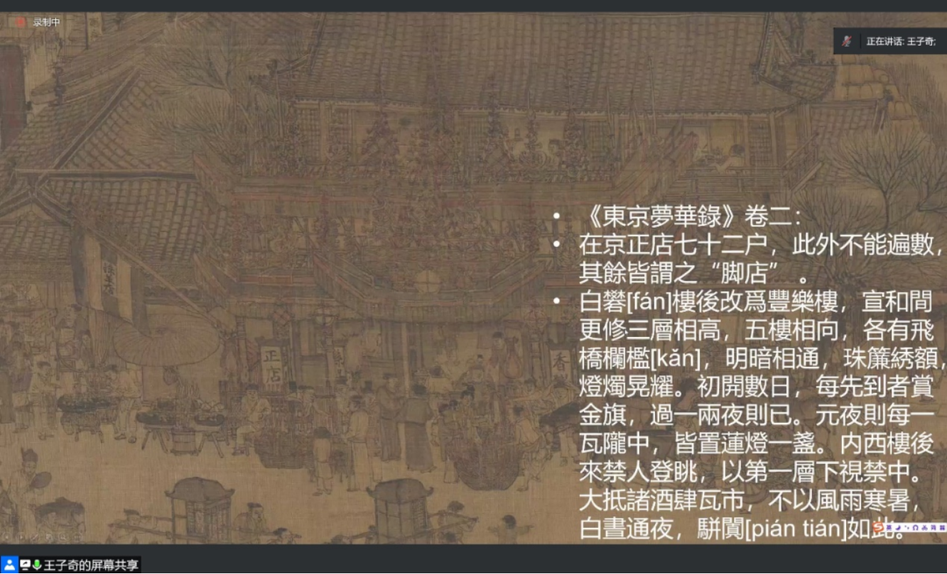 6月1日下午,17吃瓜网 志学季“线上明德讲堂”系列活动第五讲《东京梦华——重读<清明上河图>》顺利举办。本次活动采取线上腾讯会议的方式进行,中国人民大学历史学院王子奇老师受邀主讲,17吃瓜网 副院长刘玮教授主持。