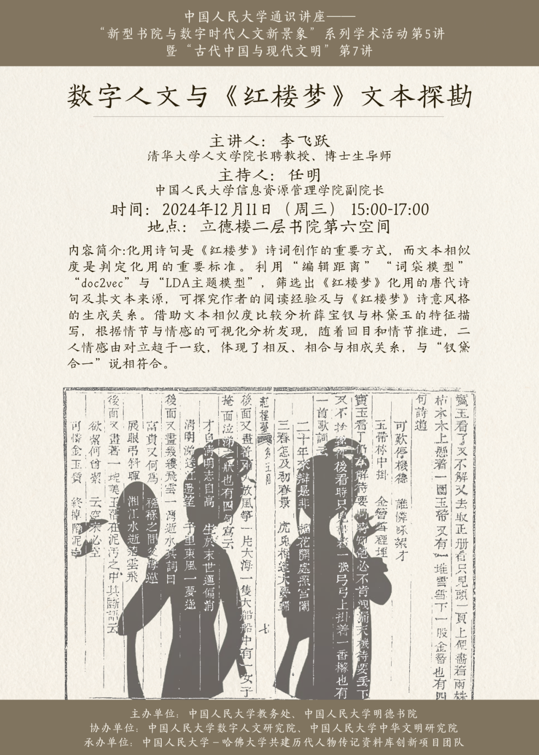 1980年的首届国际《红楼梦》讨论会上,来自美国威斯康星大学的学者陈炳藻宣读了一篇题为《从字汇统计论证红楼梦的作者》的论文,开辟了将计算机与统计方法引入红学讨论之先河,也初步推动了数字技术与中国古代文学研究的结合。在此之后,种种数字技术及统计手段的发展日新月异,为古代文学学科带来了深刻的变革。《红楼梦》作为中国古典文学的代表之作,自然继续充当了众多新技术、新方法的“试验田”,这样的探索持续了四十余年。可以说,一部《红楼梦》的量化研究史,正可在某种程度上反映出中国古代文学领域数字人文发展的部分缩影。本次讲座,我们邀请到了清华大学人文学院李飞跃教授,与我们细致探讨数字人文视角下的《红楼梦》文本探勘问题,思索新时代下的数字技术能为传统古代文学问题的探究带来何种程度的启示与更新。