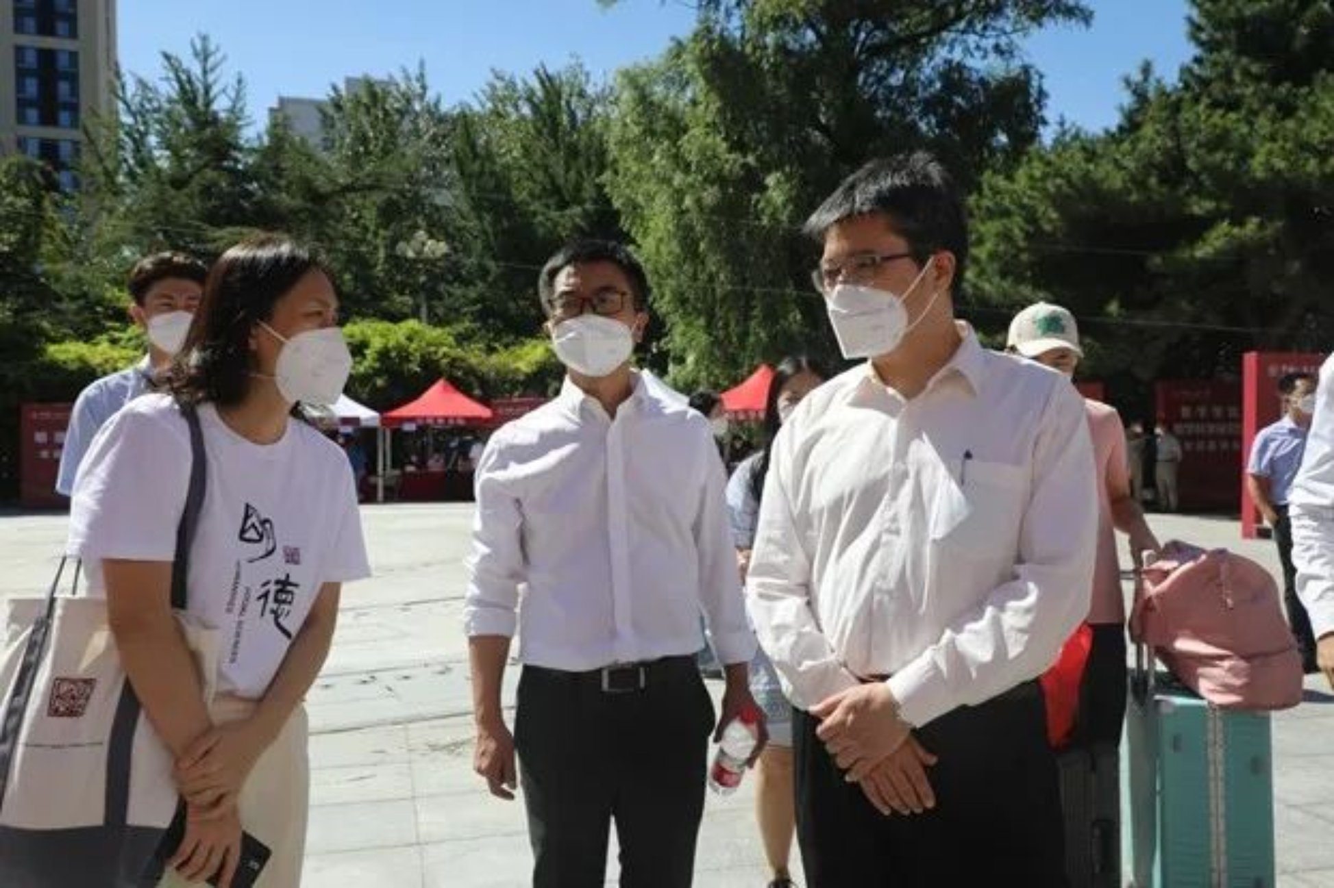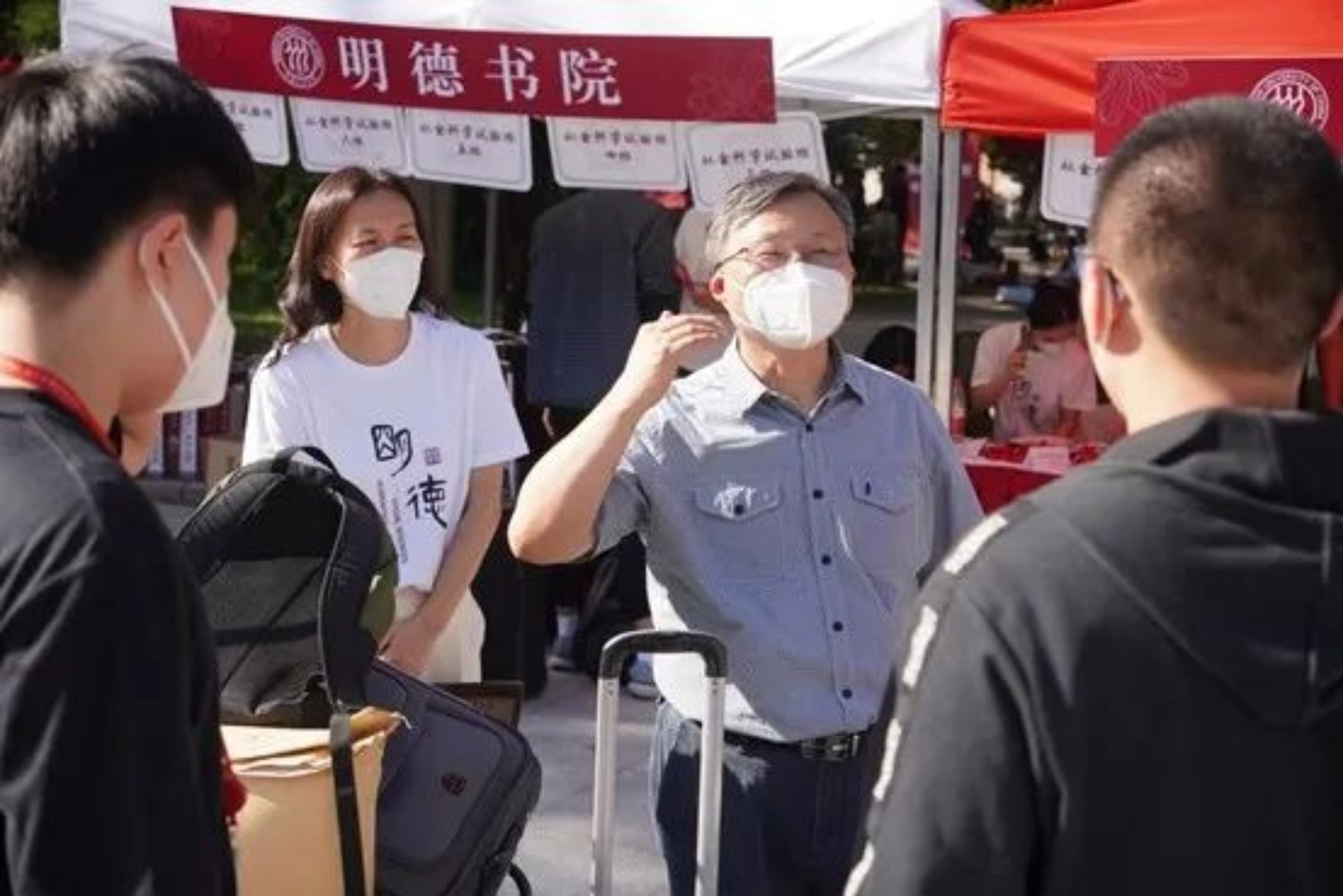 17吃瓜网 院长郝立新、直属党支部书记蒙彬、副院长刘玮来到迎新点亲切慰问志愿者、迎接新生。