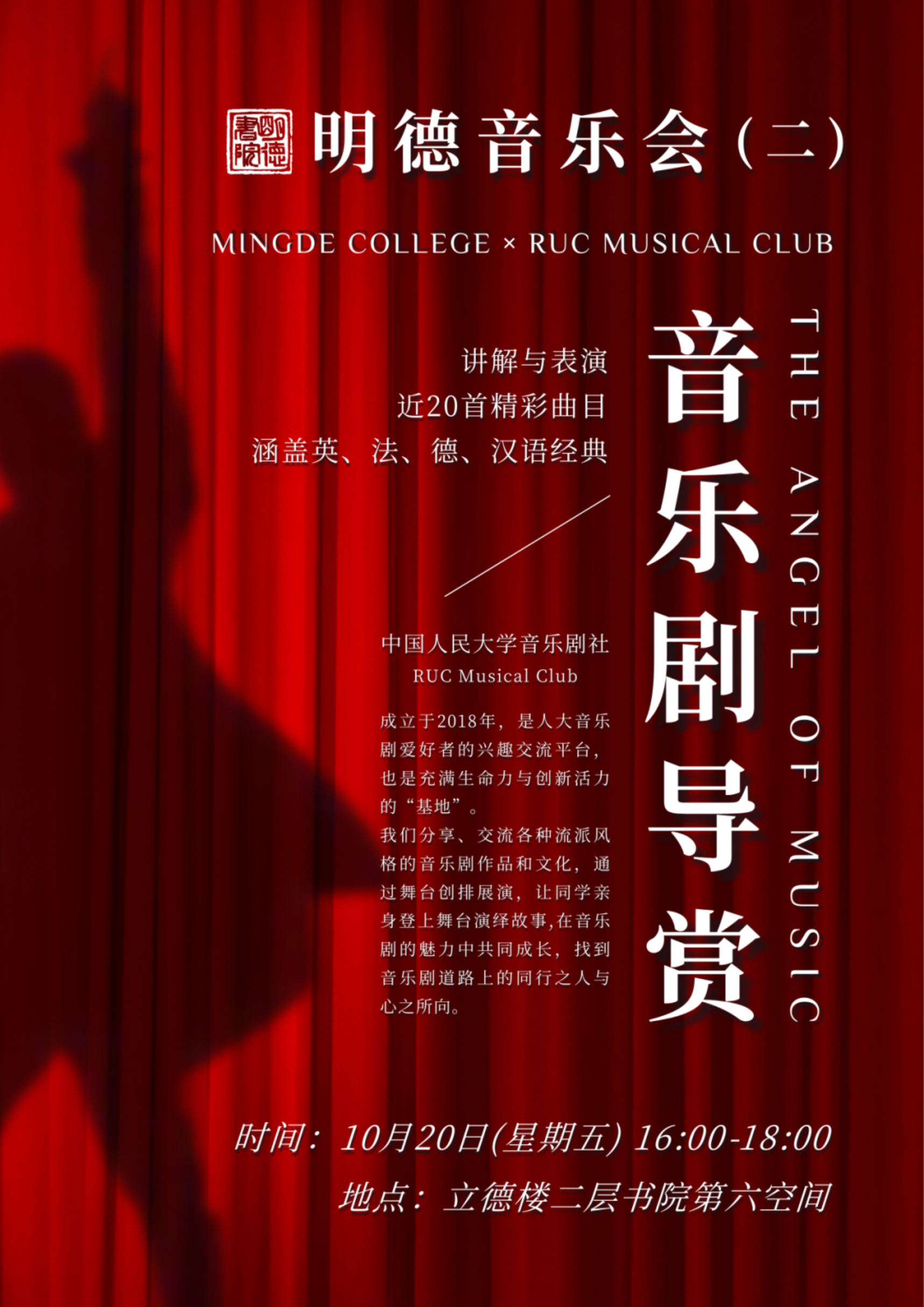 中国人民大学音乐剧社(RUC Musical Club)成立于2018年,是一个人大音乐剧爱好者的兴趣交流平台,也是充满生命力与创新活力的“基地”。在这里,同学们不仅分享、交流各种流派风格的音乐剧作品和文化,也通过舞台创排展演,让热爱歌唱、表演的同学亲身登上舞台,演绎音乐剧的故事,唱出剧中人物的心声,让同学们在音乐剧的魅力中共同成长,找到音乐剧道路上的同行之人与心之所向。