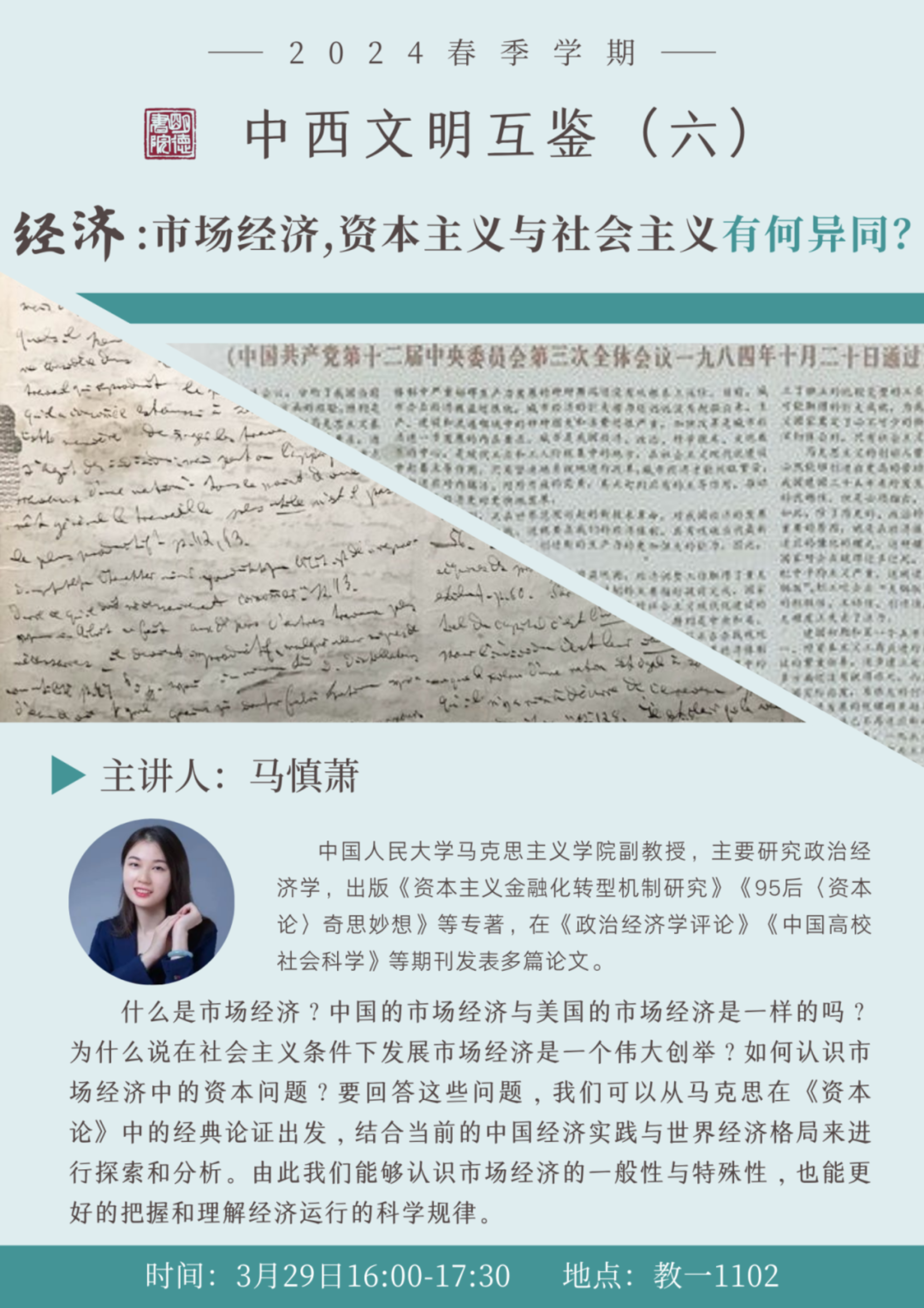 马慎萧,中国人民大学马克思主义学院副教授,主要研究政治经济学,出版《资本主义金融化转型机制研究》《95后〈资本论〉奇思妙想》等专著,在《政治经济学评论》《中国高校社会科学》“World Review of Political Economy”等期刊发表多篇论文,主要讲授“《资本论》研究”“马克思主义基本原理”“中国共产党与当代中国经济”等课程。