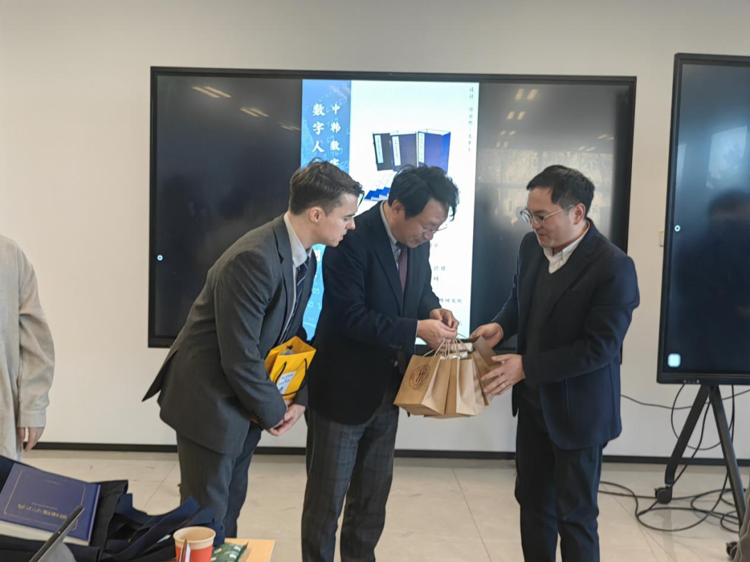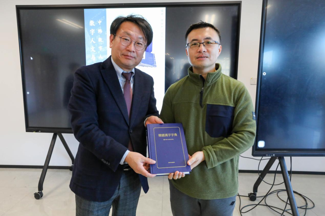 在中场休息时间,中韩双方老师互相赠送礼品。韩方老师向中方赠送由檀国大学汉文教育研究所出版的《韩国汉字字典》,字典收录了只在韩国使用的汉字,梳理其音义。中方老师向韩方赠送中国人民大学特色纪念品。