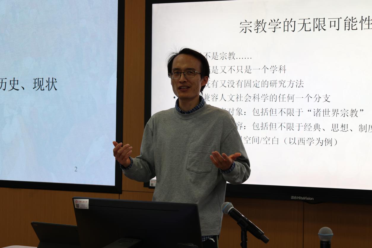 孙帅老师讲述了“宗教学的无限可能性”。首先,宗教学不是宗教,宗教学既是又不只是一个学科,既有又没有固定的研究方法,兼容着人文社会科学的任何一个分支;其次,宗教学的研究对象包括但不限于“诸世界宗教”,研究内容包括但不限于经典、思想、制度、历史、现状,宗教学研究有着无限的空间。
