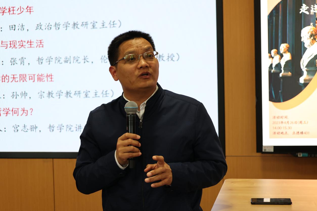 4月26日下午,“走进学院”系列活动第七期“走进哲学院”顺利举办。哲学院党委书记张鹏举老师、副院长原理老师、副院长张霄老师、政治哲学教研室主任田洁老师、政治哲学教研室宫志翀老师、宗教学教研室主任孙帅老师出席活动,2022级人文科学试验班同学参与活动。