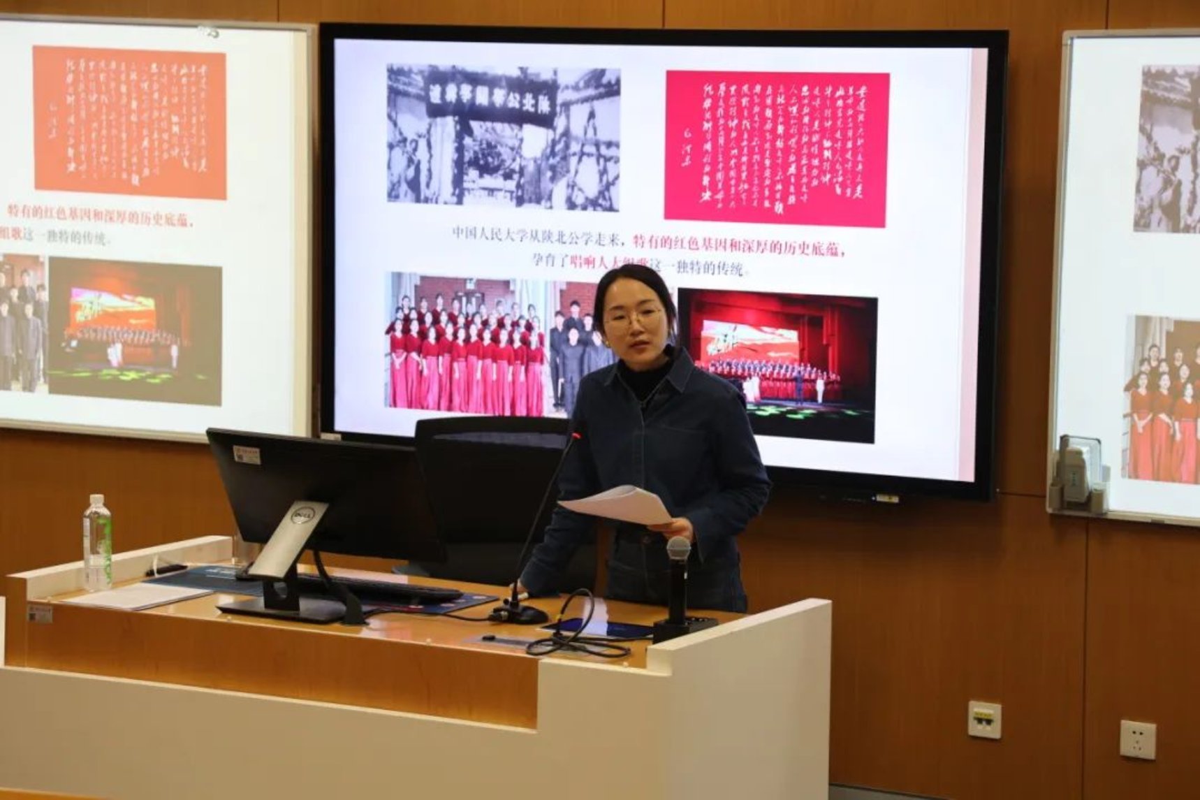许艳艳从中国人民大学自陕北公学时期承载的特有红色基因、深厚历史底蕴出发,追溯了人大组歌的历史渊源,帮助同学们进一步理解歌曲背后的深厚意蕴,感悟全民族抗日救亡的崇高爱国精神与新时代人大人的使命担当。她强调,陕公精神随歌声代代传承,作为人大学子、陕公后人,要坚定理想信念,矢志爱党爱国爱民,纵有千难万阻不降其志、不改初心,去成为那“一大批人”,在实现中华民族伟大复兴的征程中贡献青春力量,唱响自己的青春赞歌。