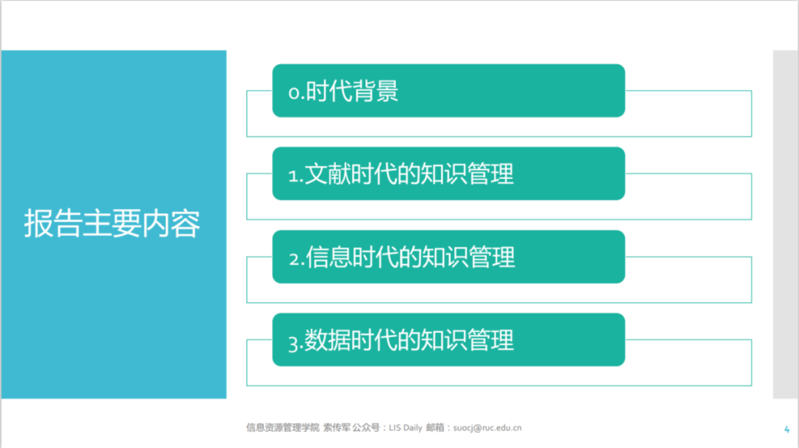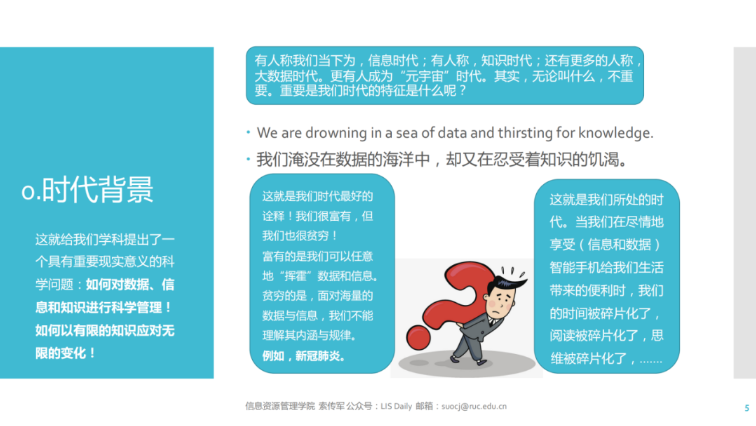 本次讲座主要从文献、信息和数据三个不同时代,结合信息资源管理的相关二级学科,一方面讲述知识管理的发展和变迁,另一方面讲述本学科的核心知识体系与专业技能。同时,立足于当前数据智能时代知识管理领域存在的重大问题,通过具体事例讲述一些亟待探究的新领域、新方向。