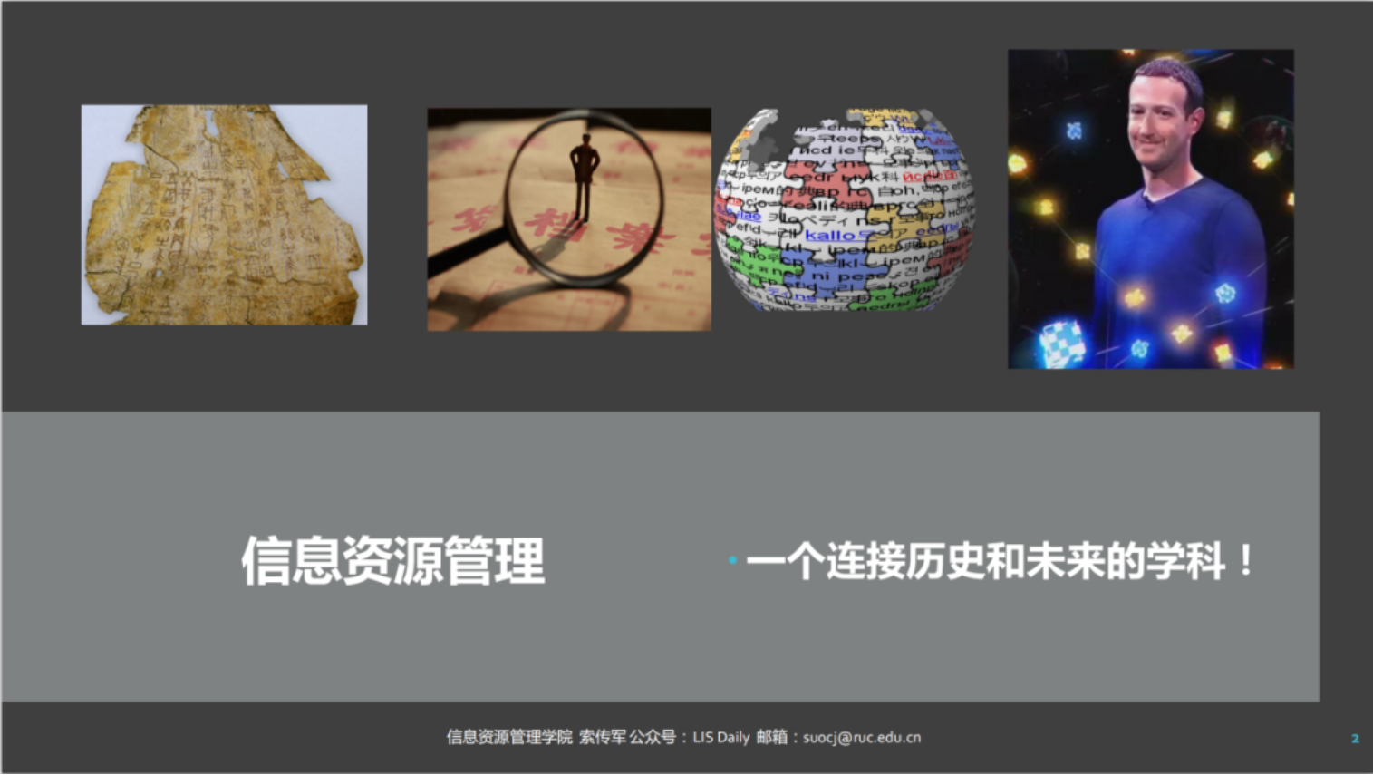 索传军老师开门见山地指出,知识管理问题是一个大家都或多或少有所接触的普遍问题,并介绍了信息资源管理学,一个连接历史与未来的学科。从古代的甲骨、文献,到发展中体系越发完善的档案、图书馆等资料体系,再到通向未来的“元宇宙”,我们可以发现,对知识和信息的处理总是离不开知识管理、信息资源管理的体系。