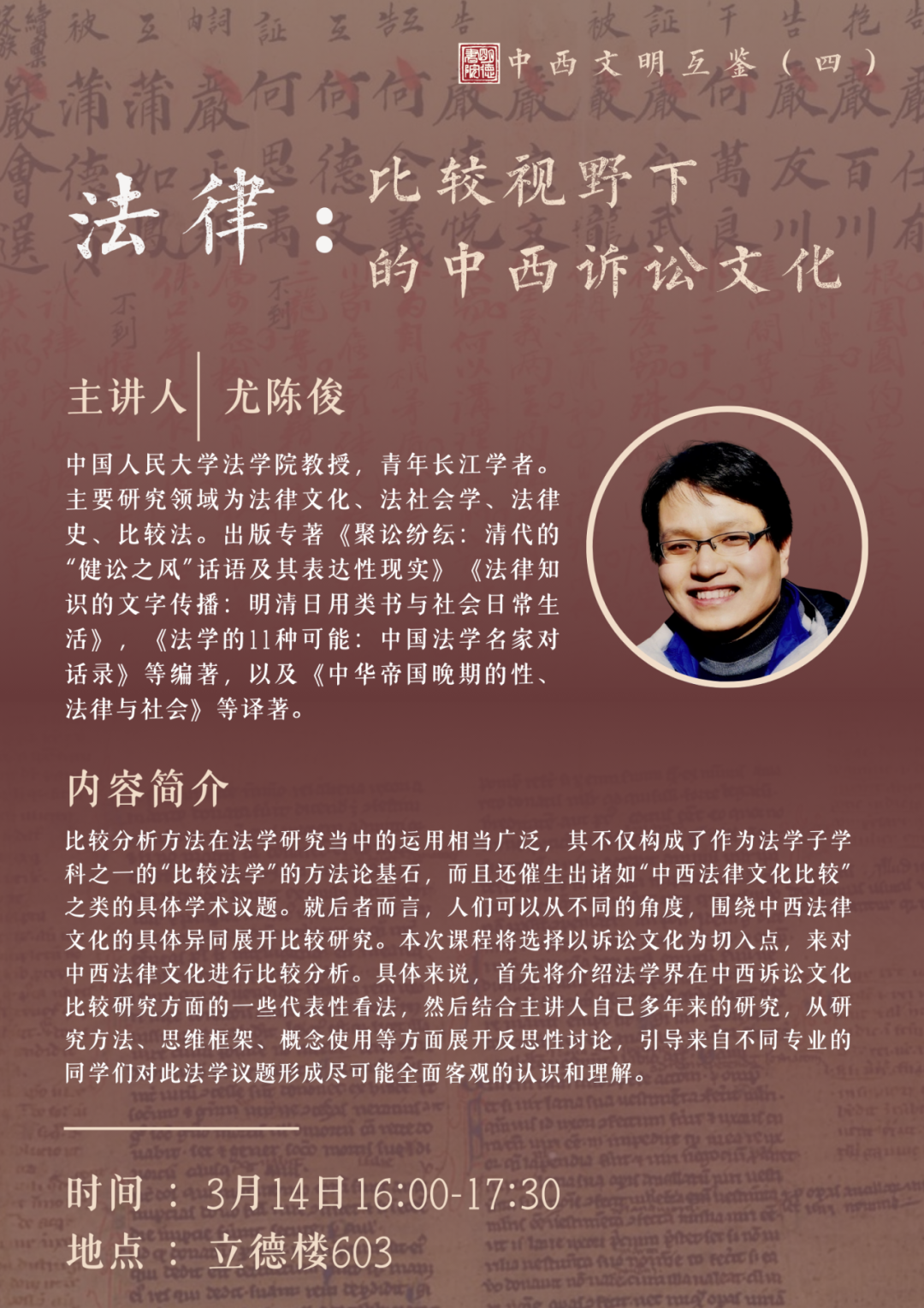 比较分析方法在法学研究当中的运用相当广泛,其不仅构成了作为法学子学科之一的“比较法学”的方法论基石,而且还催生出诸如“中西法律文化比较”之类的具体学术议题。就后者而言,人们可以从不同的角度,围绕中西法律文化的具体异同展开比较研究。本次课程将选择以诉讼文化为切入点,来对中西法律文化进行比较分析。具体来说,首先将介绍法学界在中西诉讼文化比较研究方面的一些代表性看法,然后结合主讲人自己多年来的研究,从研究方法、思维框架、概念使用等方面展开反思性讨论,引导来自不同专门的同学们对此法学议题形成尽可能全面客观的认识和理解。