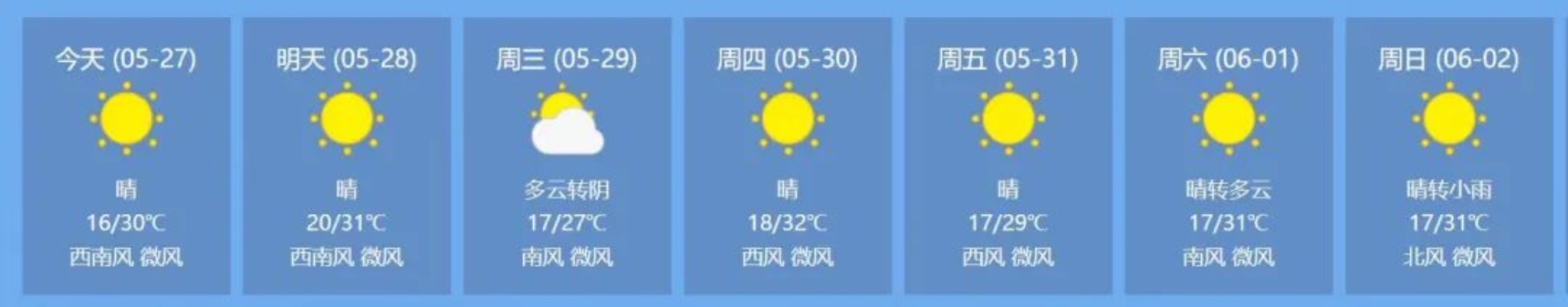 5月27日-6月2日,主要为晴朗天气,气温高,但昼夜温差仍较大,同学们在出行时注意添衣保暖,谨防感冒。本周白天最高气温在27~32℃之间,夜间最低气温在16~20℃之间,且周中气温有明显升高现象,周六、周日天气炎热,请在白天出行做好防晒,谨防中暑。