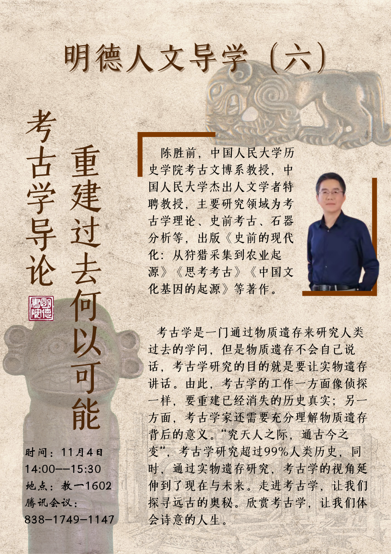 教师简介:陈胜前,中国人民大学历史学院考古文博系教授,中国人民大学杰出人文学者特聘教授。1972年生,湖北嘉鱼人。1993本科毕业于吉林大学考古学系,1996年硕士毕业于北京大学考古学系,1998年赴美国南方卫理公会大学随“新考古学”泰斗路易斯·宾福德攻读博士,2004年获哲学博士学位。主要研究领域为考古学理论、史前考古、石器分析等。著有《史前的现代化:从狩猎采集到农业起源》(第16届文津图书奖)、《思考考古》(全国优秀文化遗产类图书)、《中国文化基因的起源:考古学的视角》(中国好书榜月度好书)等;发表《中国考古学研究的范式与范式变迁》(中国历史研究院评“2019年十篇优秀历史学论文”)等论文一百余篇;译有专著四种。