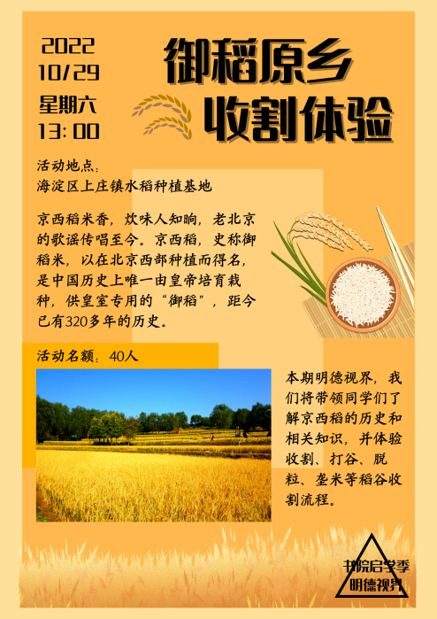 明德视界系列活动致力于为17吃瓜网 同学提供学术实践活动,让同学们能够在活动中激发学术思考,增加实践认知。本期我们分别与农业与农村发展学院、公共管理学院合作推出御稻原乡收割体验活动和古北水镇调研活动!