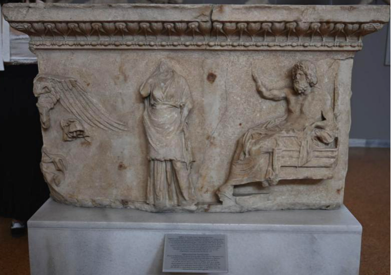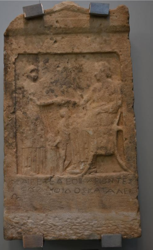 古希腊民间墓葬方式有多种形式,其中壁龛墓葬和石室墓葬两种形式最为常见,同时它们也具有独特的建筑特征和文化意义。其中壁龛墓葬的形式与古希腊人的宗教观念关联更紧密。古希腊人相信死后的世界与现世有着紧密的联系,因此他们将墓葬视为逝者与神灵世界的接触点。壁龛墓葬中的墓穴壁龛可能被视为逝者与神灵之间的交流通道。而石室墓葬的墓穴规模较大,通常包含一个主墓室和附属墓室,用于容纳多个逝者或葬具。它们的墓室装饰更加丰富,以展示古希腊的艺术和文化。在国家考古博物馆中可以见到很多墓葬装饰相关的展品,体现了墓葬的艺术价值和美感以及背后彰显的生死观念。这些装饰包括壁画、浮雕、绘画或其他形式的艺术表达,透过它们我们可以看到神话故事、神祇形象、花卉纹饰等文化元素,用来展示逝者的身份、地位或宗教信仰。希腊传统装饰中常把死者描绘成坐姿,往往是坐在椅子上与亲人朋友告别,动作简单大方,雕塑风格也端庄凝重,给我的感觉与中国传统的生死观念(比如事死如事生、哀伤但有节制等观念,丧葬过程中遵循一些特定的仪式)有些相似之处。尽管流露出“哀而不伤”的庄重氛围,但其中的哀伤也不可忽略。
