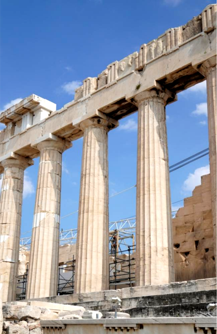 站在久负盛名的帕特农神庙面前,放眼望去没有其他的参照物,即使是断壁残垣也让人觉得高大伟岸。这种特殊的设计方式以及建筑所需要的大量材料,都可以表明当时雅典人对雅典娜以及对奥林波斯众神的崇拜。这种崇拜背后隐含的即是人与神的截然区别。我疑惑于当时的人们为什么用被称为“男人柱”的多利克式石柱建造雅典娜的神庙,而用被称为“女人柱”的艾奥尼亚式石柱建造波塞冬的神庙,也许是因为雅典娜作为只有父亲没有母亲的女神是父权制战胜母权制的象征之一,也许是因为雅典娜作为雅典的守护神,理应拥有更辉煌的神殿。原因已经不得而知。