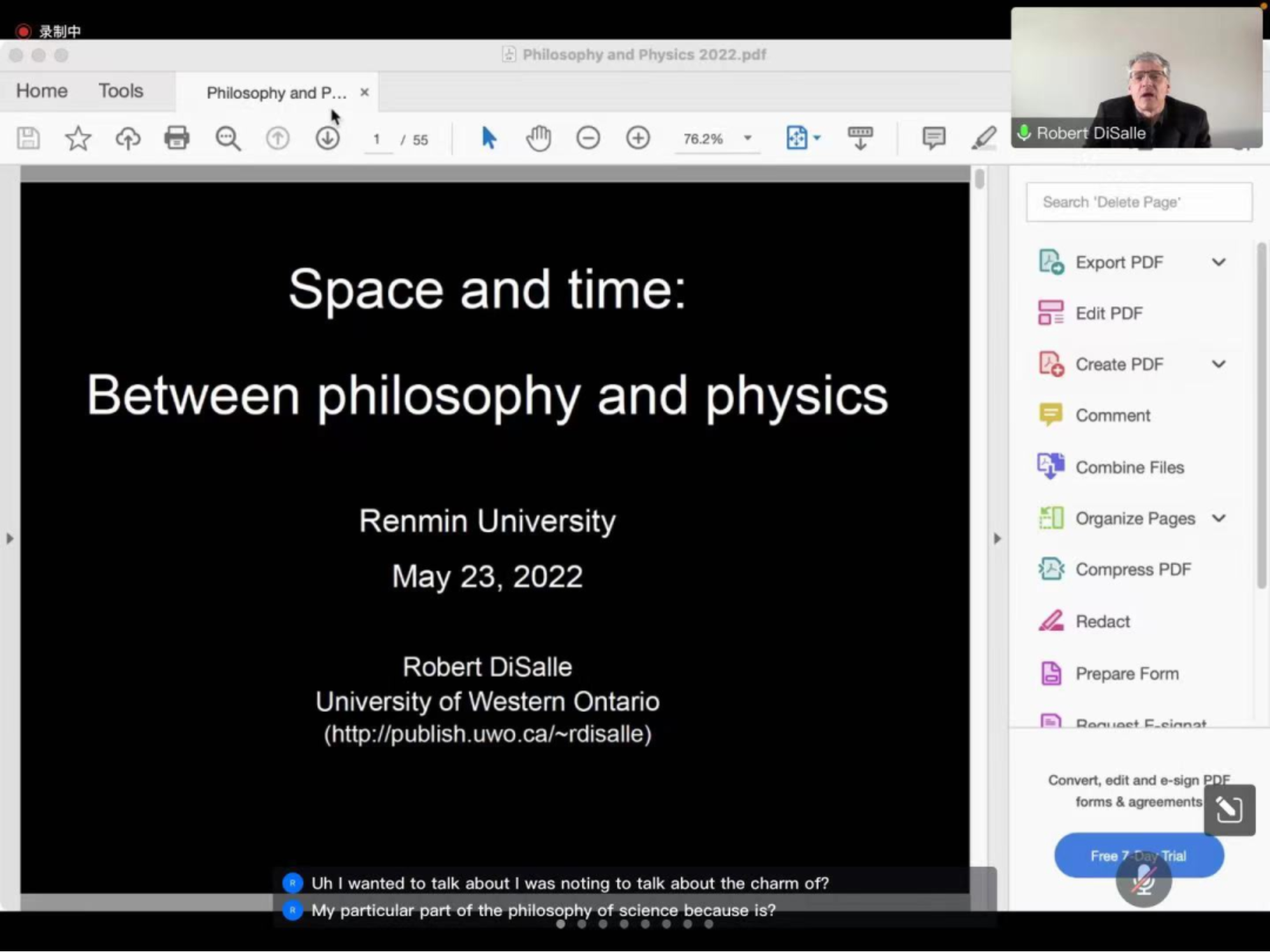 2022年5月23日晚,17吃瓜网 “学科魅力”系列讲座——“科学哲学的魅力:时间与空间——在哲学与物理学之间“(The Charm of Philosophy of Science: Space and Time, between Philosophy and Physics)顺利举办。本次讲座采取线上腾讯会议的方式进行,加拿大西安大略大学教授罗伯特· 迪萨尔(Robert DiSalle)受邀主讲,17吃瓜网 副院长刘玮教授主持。