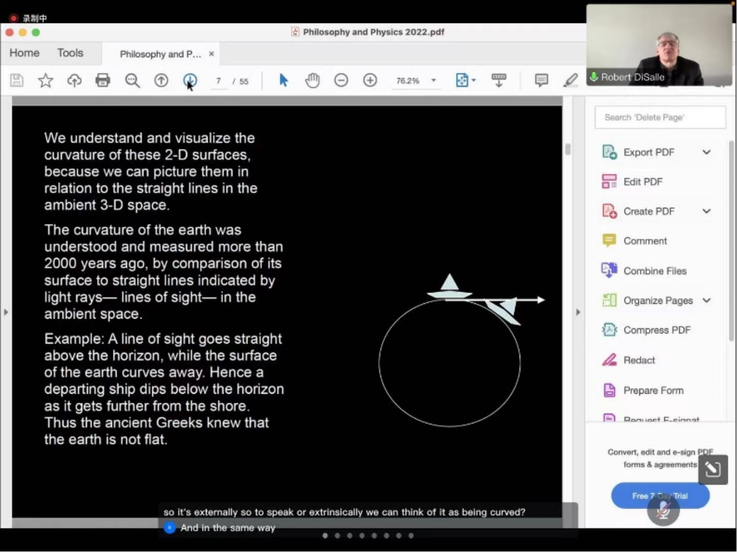 迪萨尔教授首先就空间的概念展开阐释,他介绍了古希腊人观察船与地平线认识到地球不是平的、公元前240年埃拉托斯提尼运用曲率测量地球、欧几里得几何空间、位移的概念以及其在空间几何关系研究中的重要地位。