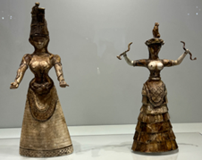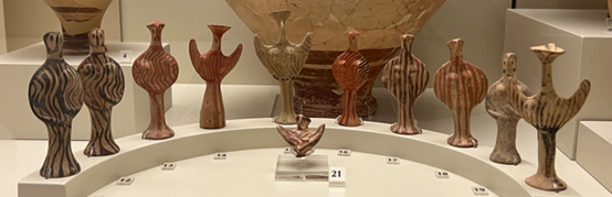 出土文物中还广泛存在着一些赤陶烧制的女性雕像,与同时期的青铜或象牙雕塑表现出不同的风格。它们高10厘米左右,有一个圆柱形的底座,身体呈圆柱形或半月形,胸部由两颗灰泥颗粒表现出来。它们全身涂着红色或黑色的花纹作为衣服,其上安着一个倒三角形的脑袋,眼睛、鼻子等。考古学家Arne Furumark根据雕像表现出的姿态将其分类:双臂高举的由于形似希腊字母Ψ,因此被称作“Psi型”;双臂垂于身前的因其与字母Φ的相似性而被称作“Phi型”,此外还有一种双臂交叉于胸前的,与字母Τ形似,被称作“Tau型”。有学者因其体现出的女性生育特征,认为它们代表着强大的女神,或者神的照料者;也有人因其亦曾出土于神殿遗址,认为它们被崇拜者用于祭祀活动,是还愿的敬献品;另有人因其也在房屋中出现,且它们的外观与孩童的葬礼存在对应关系,于是将它们看作儿童玩具。马丁·贝尔纳结合近东地区考古成果,认为这些小雕像或许兼具以上三种功能,而它们的产生受到了埃及的一种人形小雕像“沙伯替”(Shuabtis)的影响,沙伯替在埃及是与死者一起埋葬的人佣,在亡灵世界中担任死者的仆人与保护者。