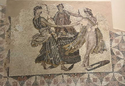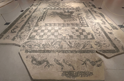 地面马赛克由平滑的天然鹅卵石制成,主要以黑色为底色,白色作点缀,嵌板上装饰有几何图形或人像,嵌板周围则点缀着不同的纹样,比如植物或花卉的图案,有些画中还刻有铭文。现存希腊世界最早的地面马赛克画可追溯到公元前5世纪。希腊化时代以来,鹅卵石马赛克逐渐被棋盘格马赛克所取代,它们大多采用修整过的小石块或方砖来进行制作,图案多为抽象图案,有些作品则带有精美的呈小方块状的中央嵌板,这些嵌板多为黑色、白色,也有彩色的。图中则是帕特拉斯出土的古罗马时期的马赛克,它们颜色多样,古朴而独具质感,其内容多涉及神话故事,有时也表现人们的日常生活。