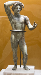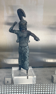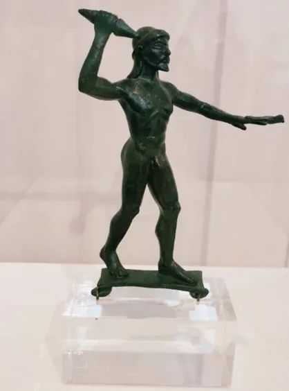 笔者认为,该雕像为海神波塞冬的几率更大一些,因为他的后臂伸展程度更大,更像是往高处和远处去投掷武器。而结合同时期出土的其他宙斯青铜像,以及叙利亚巴勒斯坦地区出土的公元前14-13世纪的迦主神风暴之神巴力的雕像,可以发现,这两位掌管雷霆的主神,右前臂与后臂之间约呈直角,稍有前倾之势,左前臂略下垂,这更符合从云端向下投掷闪电的动作,而古代文献中也有很多宙斯从云中霹下来一道闪电的记载。这个雕像中的动作幅度很大,看上去并不像从云中或山上往下投掷,而闪电很少会有从低处往上霹的,因此,笔者认为,这尊雕像表现的是即将投掷三叉戟的海神波塞冬。(当然,反对的理由主要有:三叉戟要比闪电长,从侧面看可能会遮挡脸部,而根据同时期的硬币与瓶画,古希腊人不会这么做;瓶画上的波塞冬表现的更多是击剑或向前冲刺的动作,三叉戟似乎并不用来投掷。)