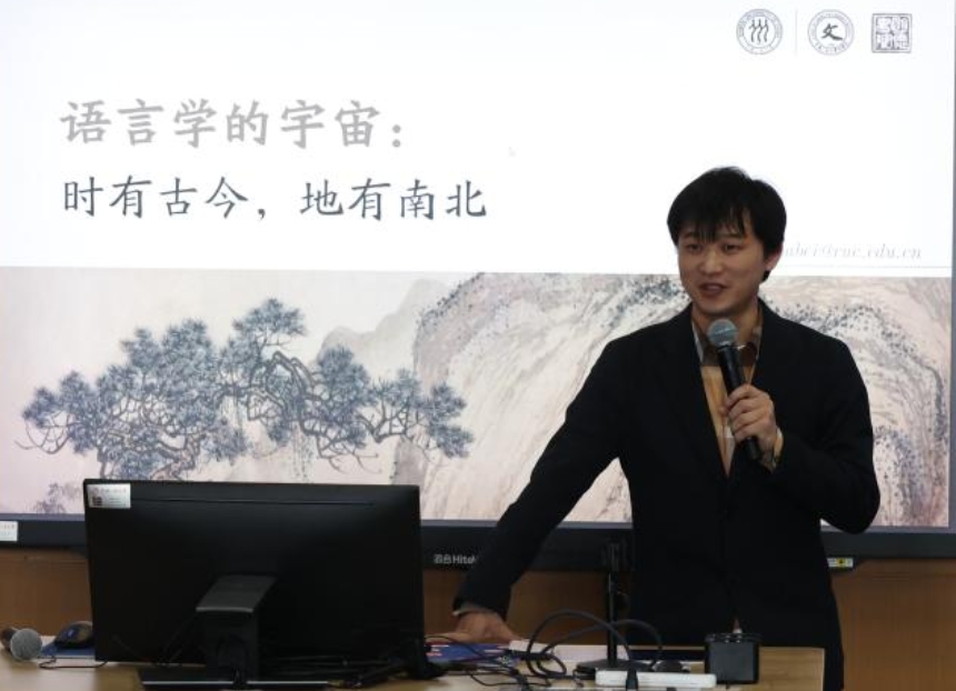曹亚北老师以“语言学的宇宙:时有古今,地有南北”为题给同学们介绍了语言学的魅力。语言学是研究语言的结构规律和演变规律的科学。曹老师引用朱德熙先生的话“学了语言学,你们就能知道孔夫子是怎样讲话的”,以《关雎》为例向我们展示了还原古代汉语面貌和发音的可能性。曹老师探讨了热点问题“天将降大任于是人也”中的“是”字究竟是“是”还是“斯”,并以历代版本和语言内部规律的制约为证据确认为“是”字。曹老师还举出人大校徽中甲骨文“人”的例子,认为实际上是一个人在“从”字旁边也想刻“从”这个字,但是他只刻了一半……最后曹老师欢迎同学们来语言学的宏大宇宙中探索一番。