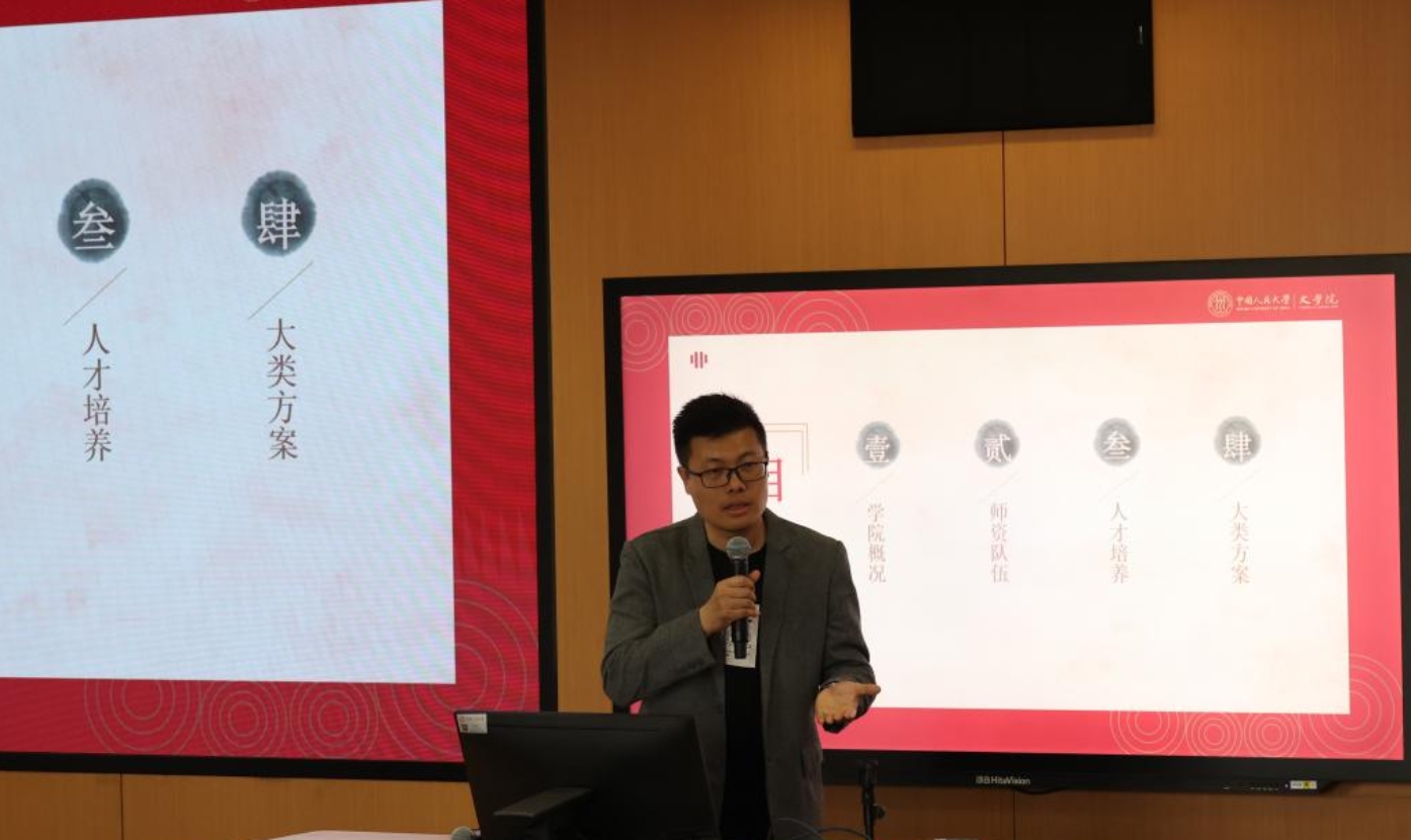 陈涛老师以“人大文学院:修辞明道,树德建言”为题为大家介绍了文学院的概况、师资队伍和人才培养。中国人民大学文学院的前身是1939年由陕北公学、延安鲁迅艺术学院等合并成立的中国新文艺孕育和发展的摇篮——华北联合大学文艺学院。近年来,中国人民大学文学院已发展成为学科体系完备、专业实力雄厚的语言文学研究和一流人才培养重镇,涵盖中国语言文学七个二级学科和戏剧与影视学一级学科,以及古典学和创造性写作两个自设二级学科。文学院先后被被批准为“国家文科基础学科人才培养和科学研究基地”“国家对外汉语教学基地”“高等学校国家级特色专业建设点”“国家级一流本科专业建设点”“首批‘强基计划’汉语言文学专业”“基础学科拔尖学生培养计划2.0基地”,拥有国家级和北京市重点学科,中国语言文学一级学科在教育部第五轮学科评估中取得优异成绩。文学院拥有雄厚的师资力量,孙郁教授率领的中国语言文学教师集体获首批“全国高校黄大年式教师团队”称号。文学院探索厚重人才培养模式,引导学生扎根中国大地,构建“学、知、行”合一的培养体系,“谢无量学术论文、文学创作大赛”“‘明德人文’厚重人才成长支持计划”“学生骨干培训计划”等人才培养项目已经实现体系化、特色化、专业化、品牌化。