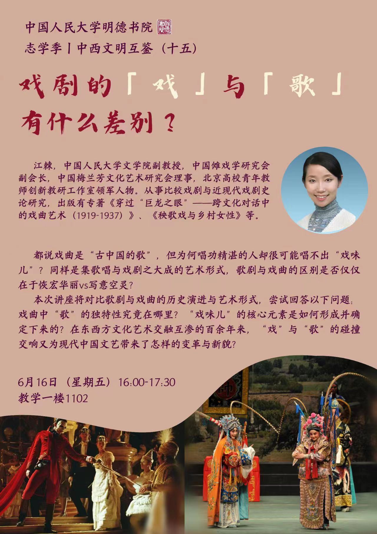 二者共性存在,是凝聚了诸如歌、舞、乐,演、景、场、事等元素的综合性艺术;但从文化差异角度,戏与歌的艺术形象、审美方式和内涵毫无疑问是有差异的。本周五,让我们跟随江棘老师,共同走入戏曲和歌剧的艺术世界,探究文化开放氛围下的碰撞交响。