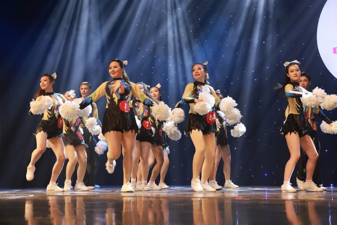 20:05,明德健美闪亮登场,以优雅的黑色为主色调的衣服搭配彩色生机的花纹与对比强烈的白色花球,队员们在炫彩的灯光下展示着近半年以来日日夜夜的练习成果。