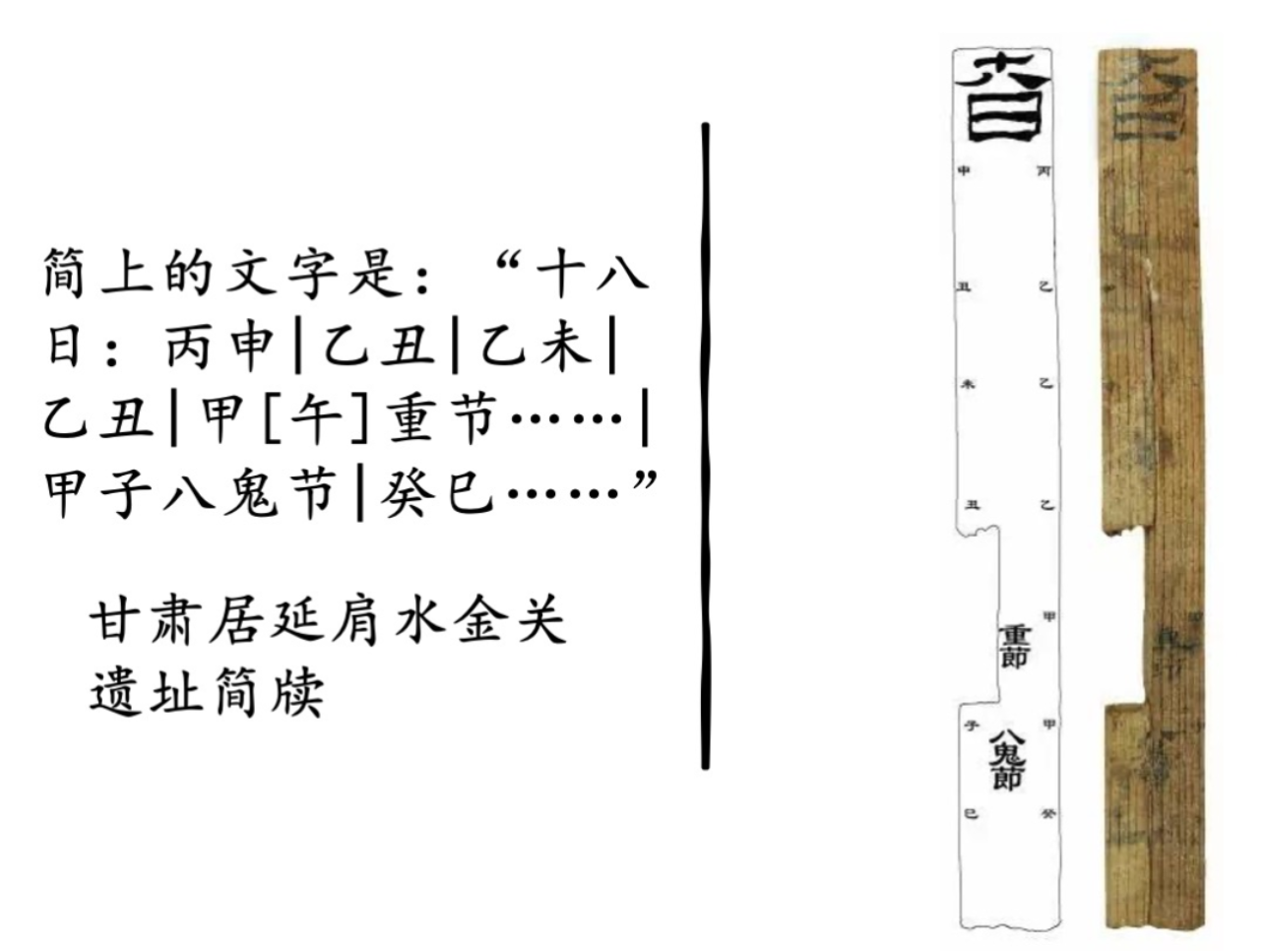 出土历史材料是对相关研究的最好佐证。上图是出土的甘肃居延肩水金关遗址简牍,上面记录的天干地支信息说明这是一个日历简,蔡老师带领我们分析并补足简牍缺失部分,联系汉代历史纪年推算,可以推测出至少在王莽摄政的西汉晚期,西北民间已经有了端午节的雏形。