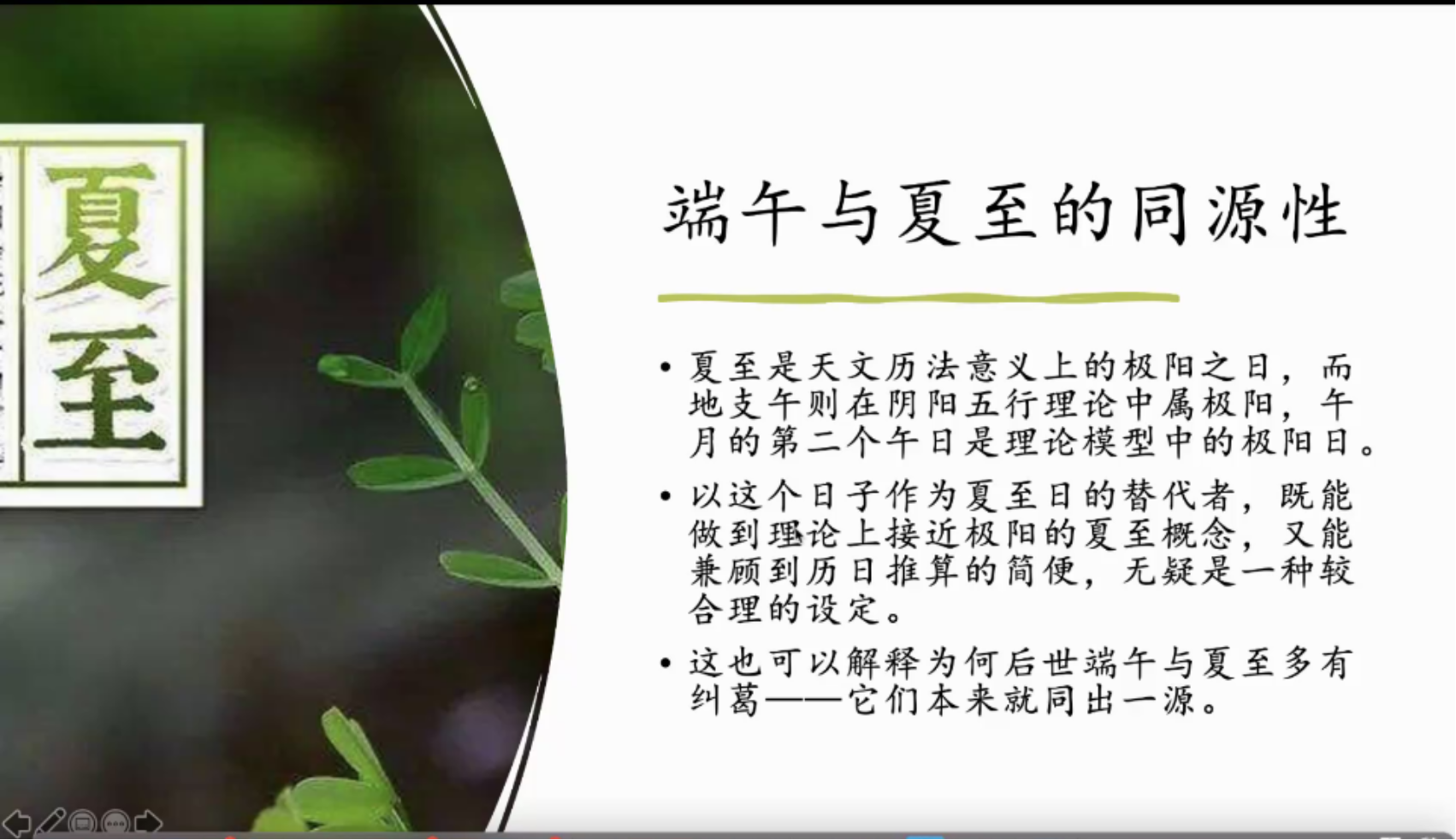 基于古文字学者的先行研究,蔡老师介绍,原始的端午节是午月午日而非五月五日,而且是第二个午日。在汉代人的宇宙观中,极阳之日是最接近夏至的日子,夏至是天文历法意义上的极阳之日,而地支午在阴阳五行中属于极阳,如此午月午日由于兼顾了理论上接近夏至和历日推算的方便而成为了一种合理的设定,所以后世中端午和夏至也多有关联。