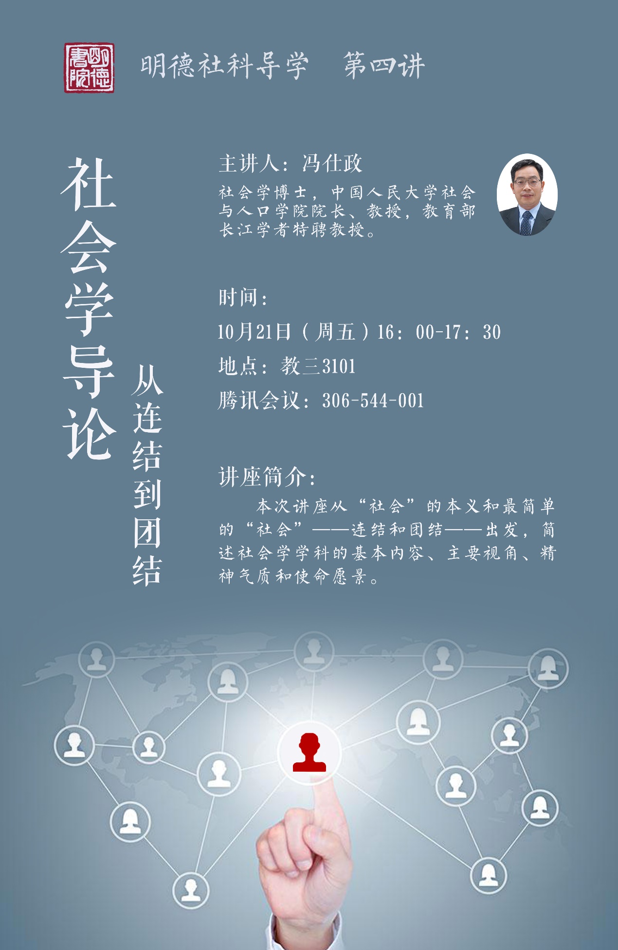 本周五(10月21日)的明德社科导学,让我们跟随冯仕政老师,从“连结”和“团结”这两个关键词入手,走进“社会学”,带着全新的认识走向我们身处的宽广社会。