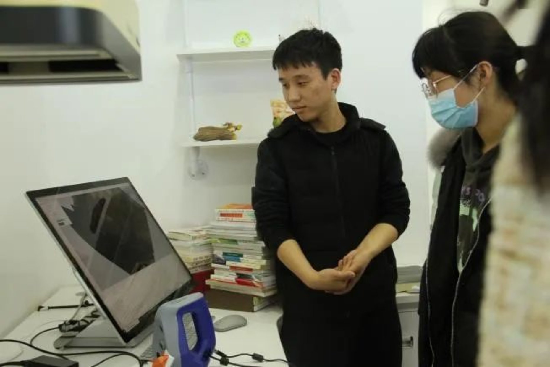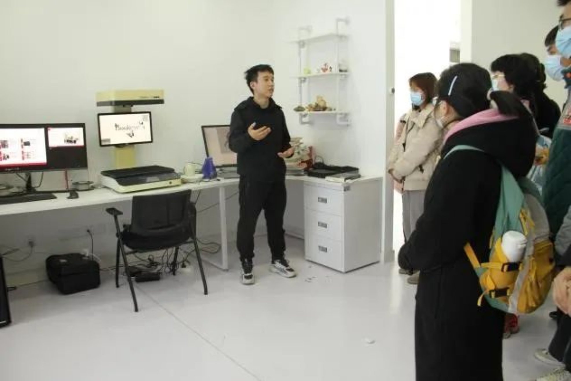 在数字人文实验室中,刘老师以扫描类手机软件作类比,向同学们演示了古籍扫描仪的工作,其能够将图像中的文字转化为文本,并在计算机中配合软件进行分析。3D扫描仪则能够发射激光,将反射结果以数据点的形式记录在机器中,经过软件分析对空间进行三维数字化。