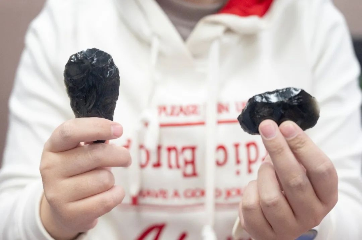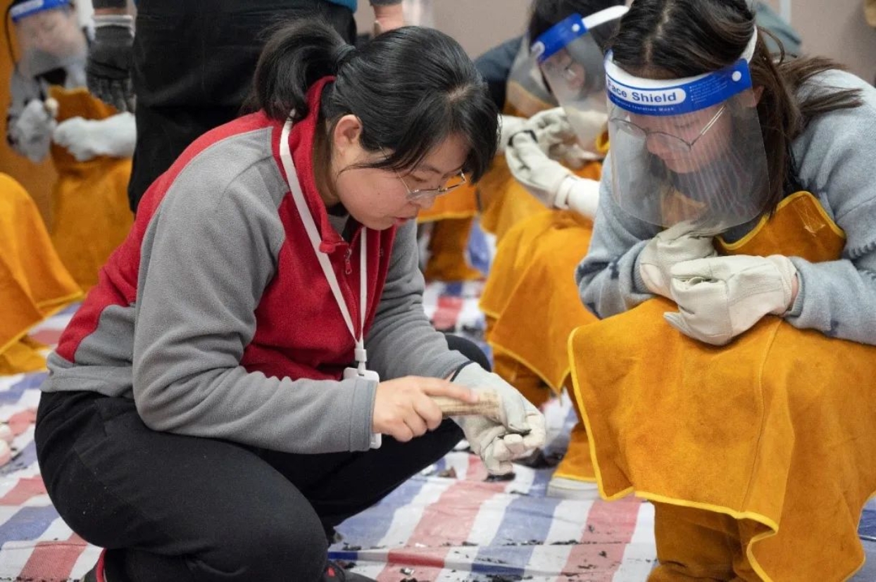 本次“体验考古”最后一项实践动手活动是模拟石器打制。这一环节由中国科学院古脊椎动物与古人类研究所高级工程师、副研究员陈福友老师和仪明洁老师指导同学们进行石器打制体验。陈老师为同学们细心讲解石器打制的工具、原料、方法和注意事项,并向大家展示近期通过模拟实验制作的石器标本。