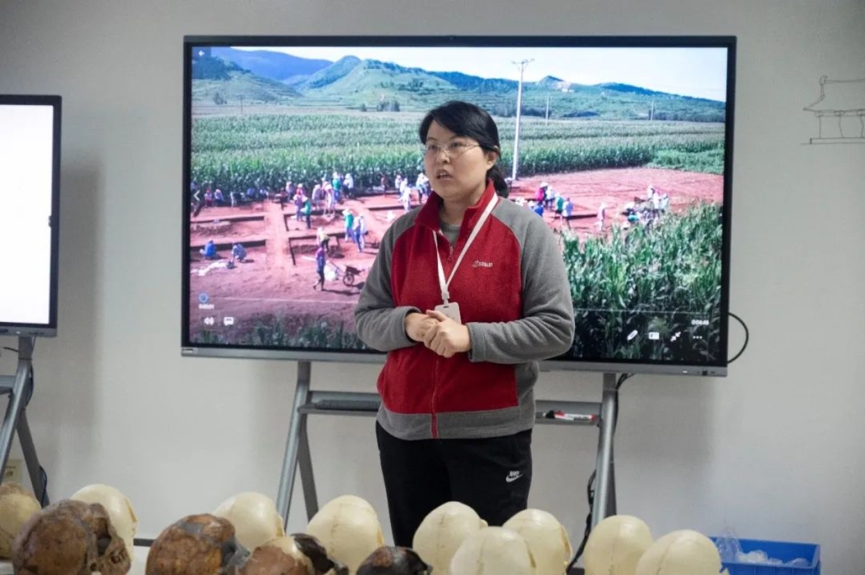 讲座结束后,同学们进入教学模型观摩环节。考古文博系三位青年教师借助古建筑模型、陶器标本、动物骨骼和人类骨骼,分别从建筑考古、人类骨骼考古、动物考古等方面,进一步向同学阐释考古学是如何利用包括人类自身在内的多种物质遗存开展科学研究的。